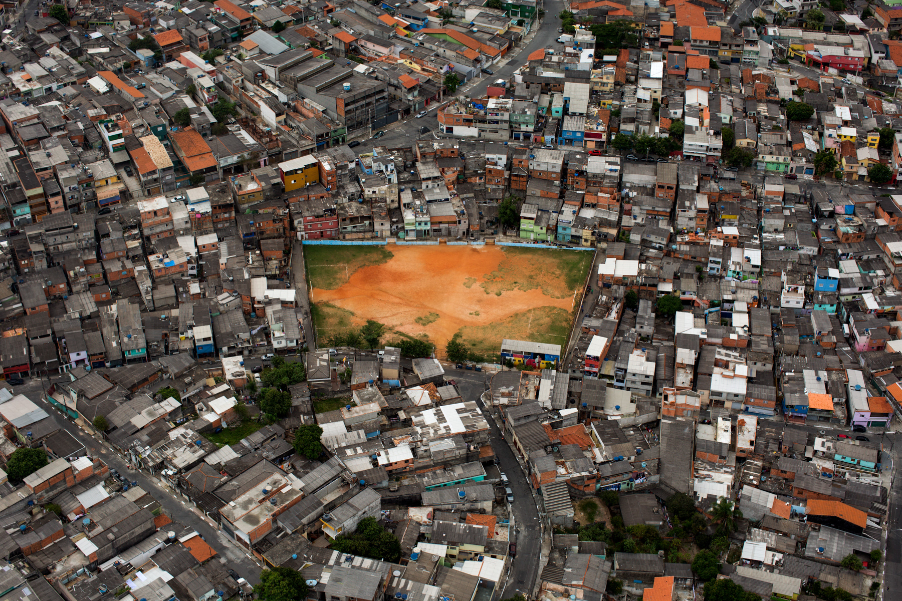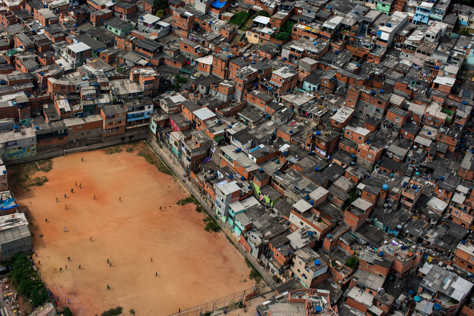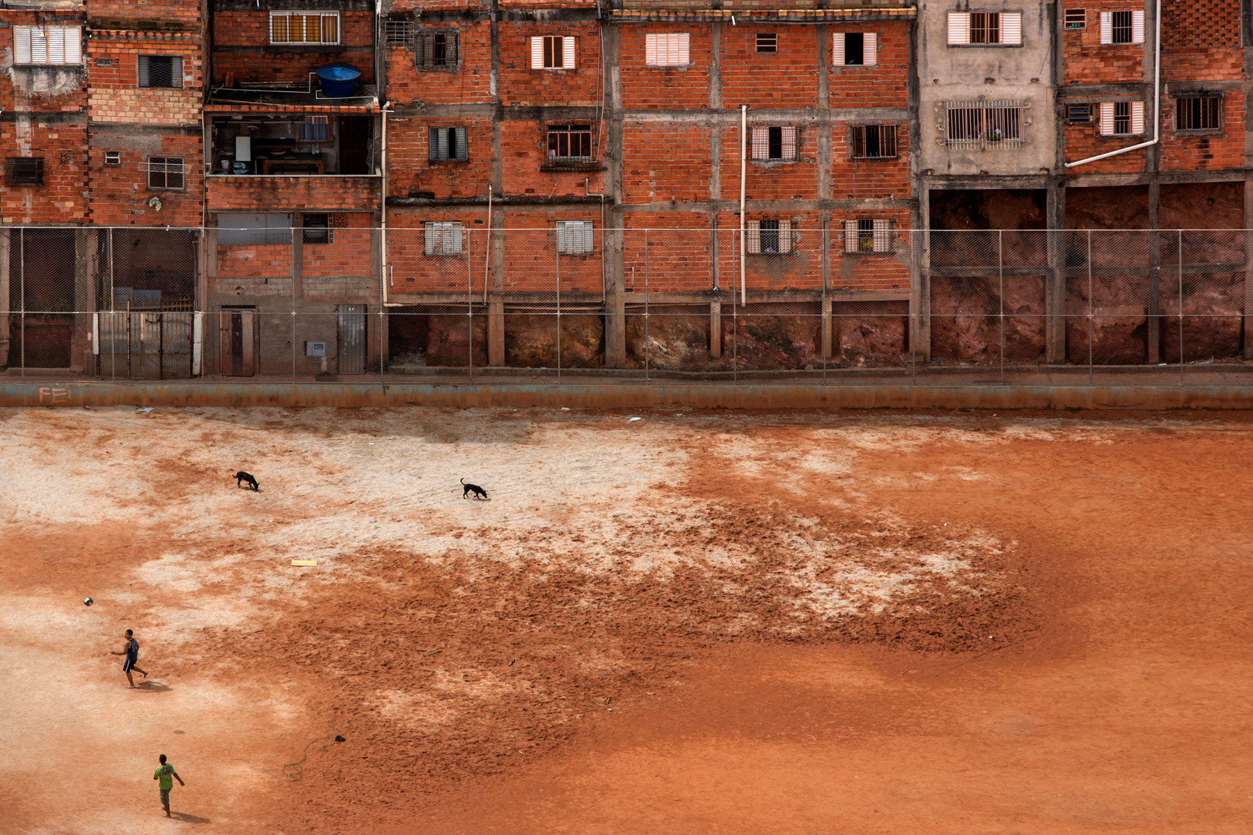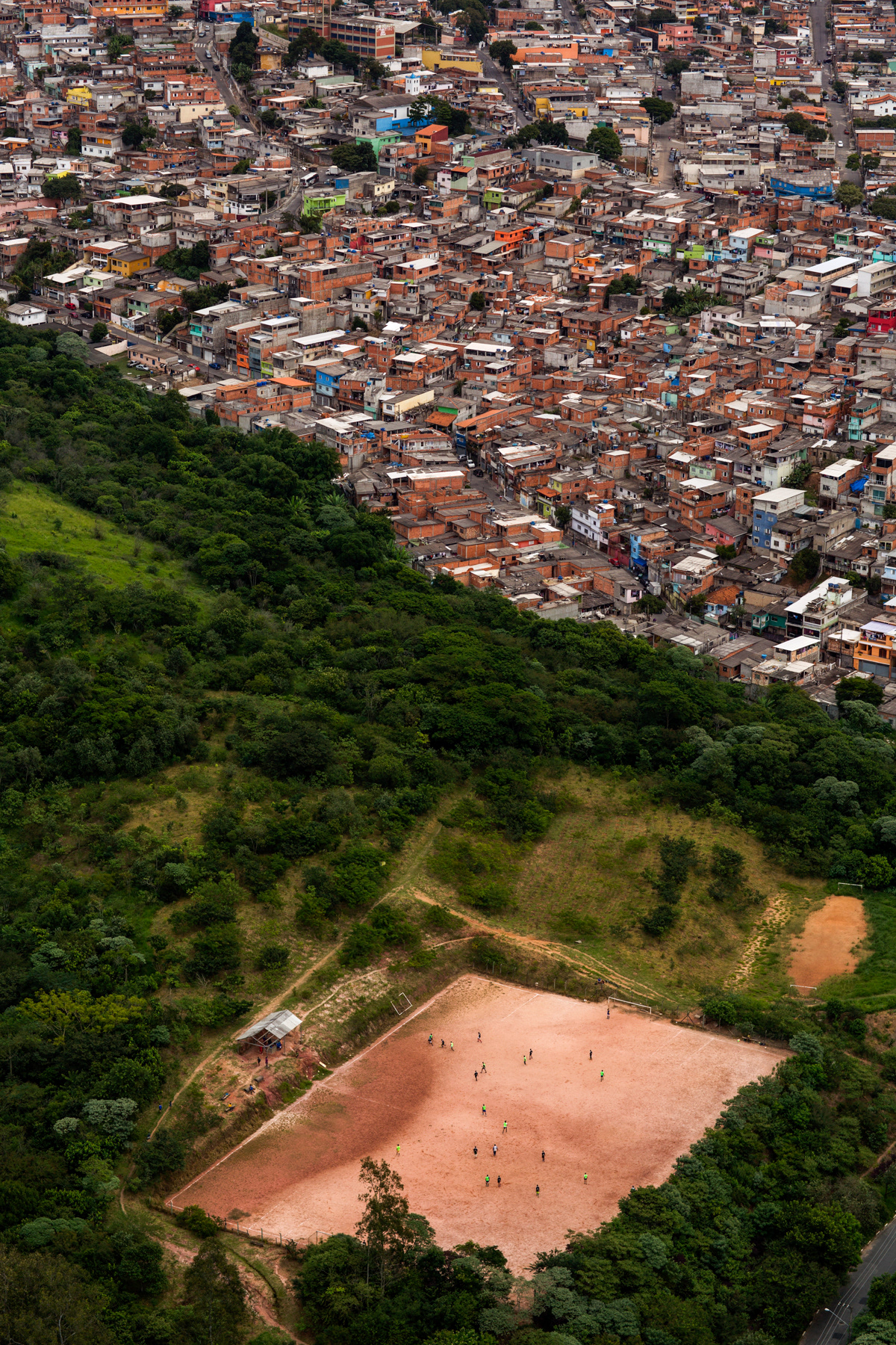 Some of them are owned by local soccer clubs, while others are public spots. Some of them are mainly dirt, while others are made of sand, or even rests of weathered grass. Nevertheless, they are a breath of fresh air for the hard daily lives of those who live in the city outskirts of Sao Paulo. These fields show the urgency for public and communal places to practice sports and to improve community living, a portrait of those who fight for leisure and a better life in a city like Sao Paulo.